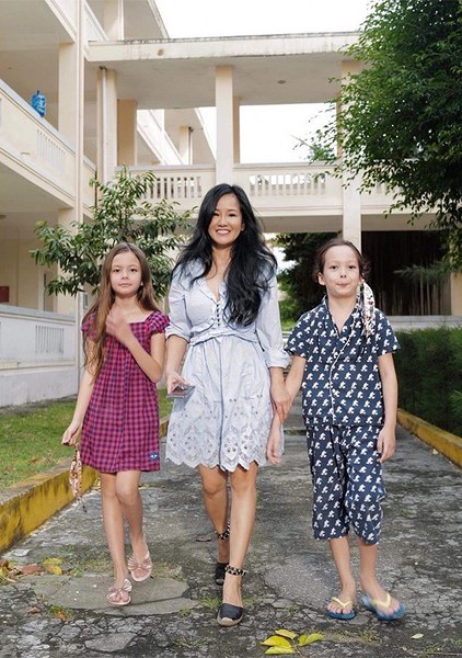 Khi dạo chơi cùng cặp song sinh Tôm – Tép ở khu cách ly tập trung tại Quảng Ninh, Hồng Nhung diện váy ngắn bèo nhún và giày đế xuồng vừa tôn vóc dáng vừa đảm bảo sự năng động.