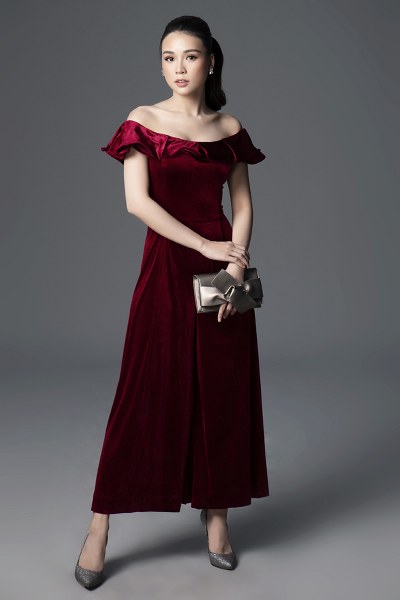 Dù không khí đã trở lạnh, nữ diễn viên vẫn không ngần ngại khoe vai trần quyến rũ trong thiết kế jumpsuit đỏ trễ vai. Gam đỏ tăng dần trên nền vải nhung mềm mịn ấm áp của chiếc đầm làm cho mùa đông bớt lạnh lẽo