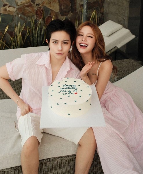 Gil Lê đón tuổi mới bên người thân, bạn bè. Hot girl Xoài Non chuẩn bị bánh kem, diện đồ đồng điệu với Gil Lê, cùng nhau thực hiện bộ ảnh kỷ niệm.