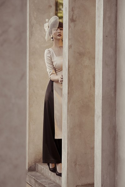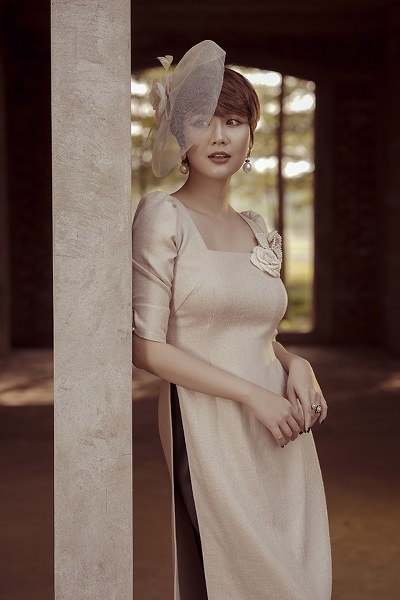 Diễn viên Huyền Lizzie tạo sự phá cách khi kết hợp áo dài với mái tóc tém cá tính và trang điểm đậm.
