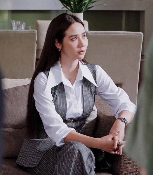 Tái xuất với vai nữ tổng tài đã có gia đình, Phan Minh Huyền ưu tiên những bộ đồ công sở kín đáo, màu trung tính, ít phụ kiện. Kiểu tóc, trang điểm của cô cũng hướng đến sự tối giản, sang trọng.