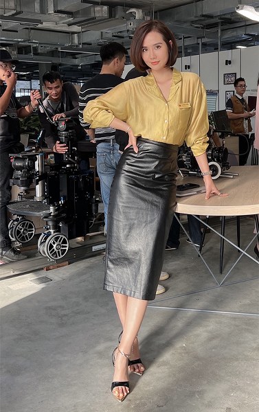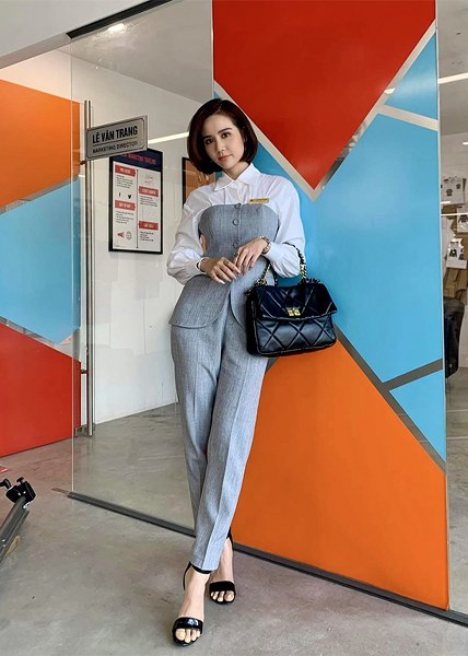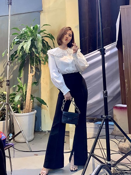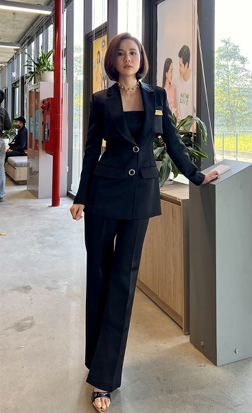Huyền Lizzie xây dựng phong cách \'nữ Tổng tài\' với suit và quần ống loe kết hợp sơ mi khi vào vai Vân Trang trong phim \'Thương ngày nắng về\'.