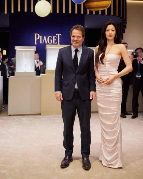 Jeon Ji Hyun chụp hình cùng ông Benjamin Comar, CEO Piaget tại sự kiện Watches and Wonders trong vai trò đại sứ thương hiệu.