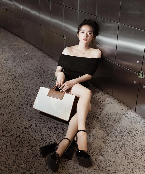 Phụ kiện được cô ưu tiên theo hướng tối giản như túi xách nhỏ hay sandals, giúp tổng thể trang phục hài hòa và thanh lịch.