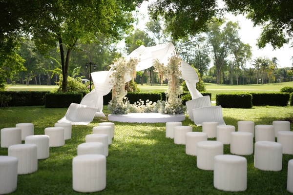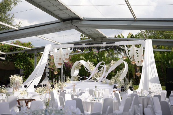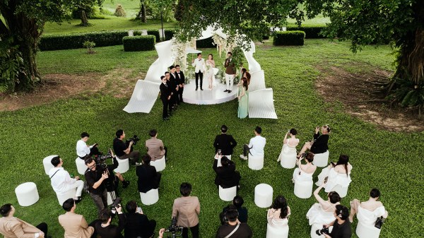 Dựa trên yêu cầu đó đơn vị trang trí Hera Wedding & Events (TPHCM) đã chọn chất liệu đang là hot trend năm 2024 là vải lụa, kết hợp với pha lê thủy tinh và nến trắng trang trí. Buổi lễ được thực hiện ngoài trời tại Sân Golf Resort rộng 3.000m2. Màu trắng chủ đạo và những chi tiết được thiết kế tỉ mỉ đã diễn tả hết được gu của chủ tiệc là sự tinh tế và lãng mạn.
