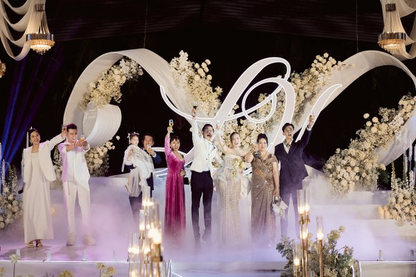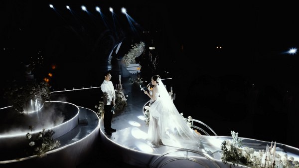 Điểm nhấn buổi lễ là khu vực sân khấu chính được trang trí hoàn toàn bằng chất liệu vải tạo hình thành biểu tượng vô cực mang hàm ý về sự gắn kết vĩnh cửu giữa đôi lứa.