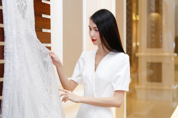 Tại đây còn trưng bày những mẫu trang phục váy cưới và phụ kiện do Joli Poli gợi ý. Phong cách áo cưới mang phong cách sang trọng nhẹ nhàng, thích hợp với từng chủ đề tiệc khác nhau. Theo một tư vấn viên kỳ cựu từ The Grand Hồ Tràm Strip, cô dâu nên ưu tiên chọn những bộ váy cưới không quá cầu kỳ, nặng nề, để có thể nhẹ nhàng di chuyển suốt lễ cưới trong không gian tiệc rộng lớn.