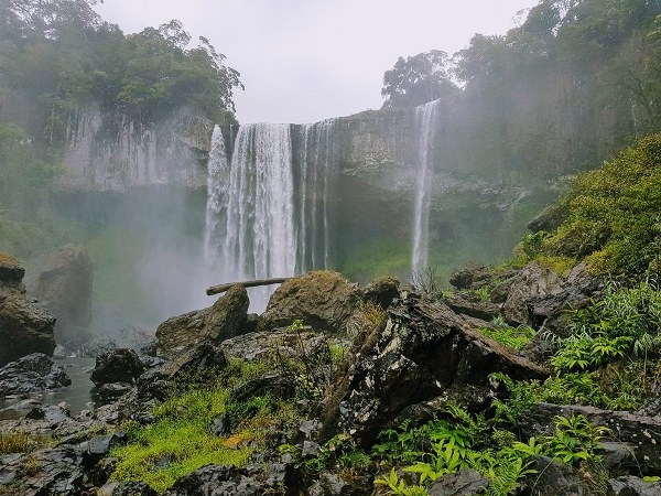 Dưới chân thác, những khối đá với muôn hình dạng kì thú, xếp chồng lên nhau tạo thành những bậc thang đứng sừng sững giữa dòng nước xanh bạc, mờ ảo trong bụi nước.