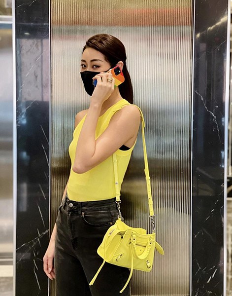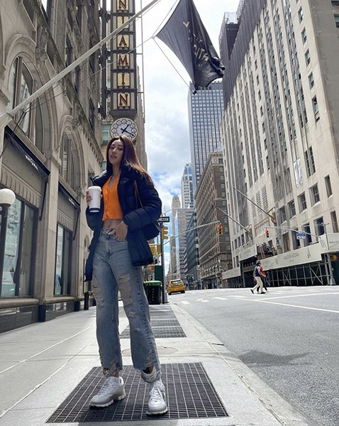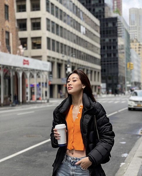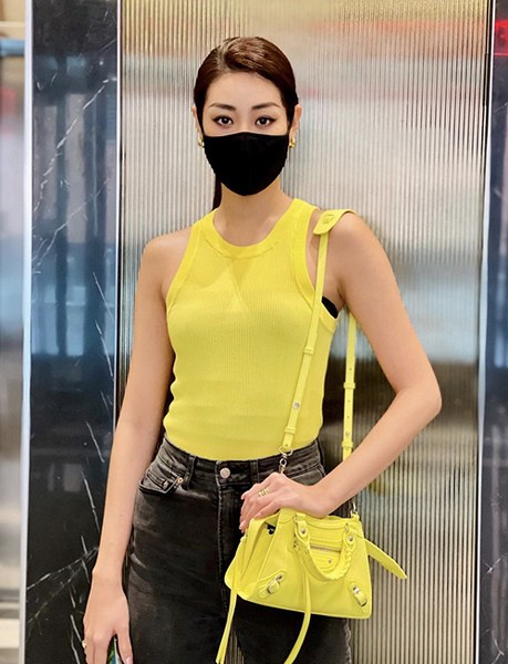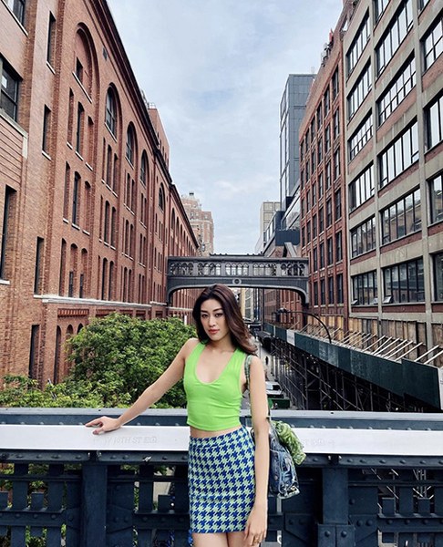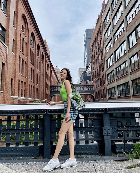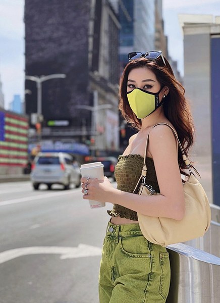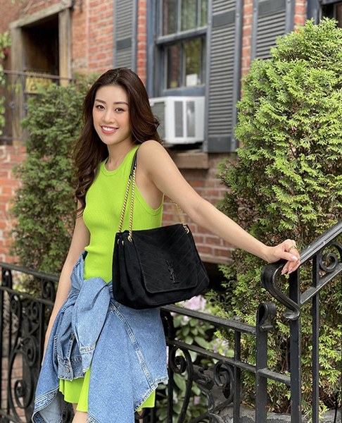 Hoa hậu Khánh Vân thường chọn trang phục màu bắt mắt để tạo điểm nhấn cho phong cách street style khi đặt chân đến Mỹ.