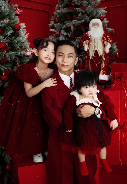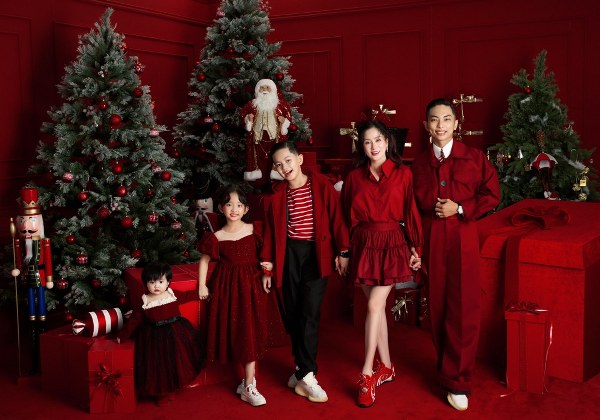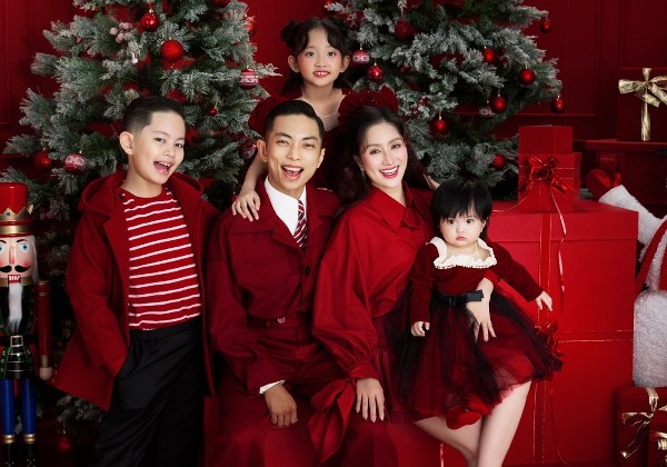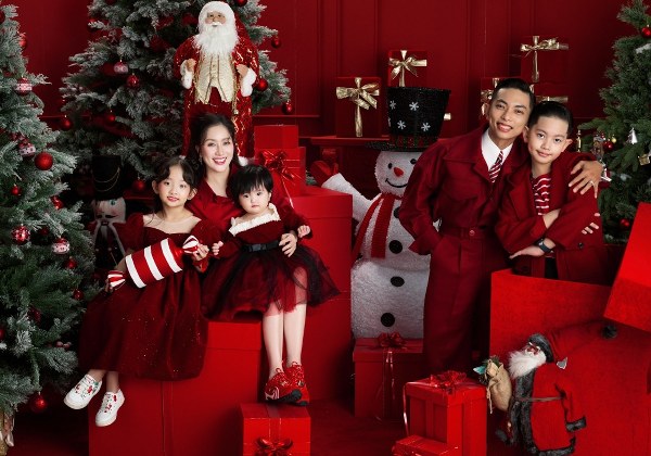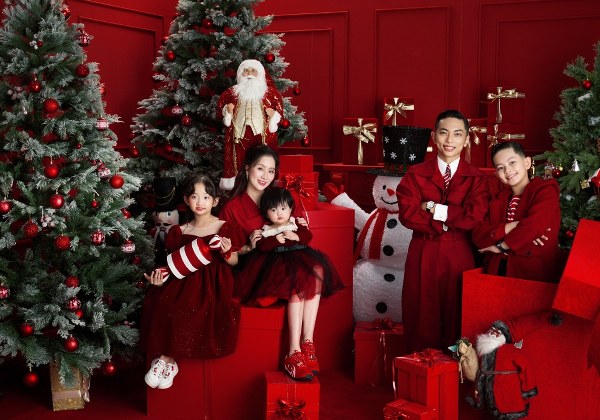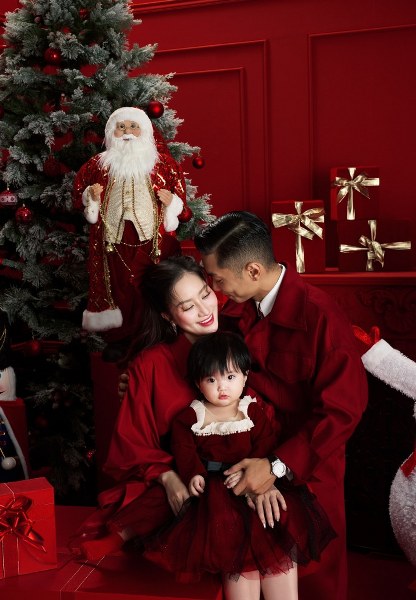 Trong bộ ảnh, gia đình kiện tướng dancesport mặc trang phục đỏ rực rỡ, tạo dáng giữa không khí Noel ngập tràn trong studio. Nhờ giảm 11kg thành công, Khánh Thi tự tin trong váy ngắn xếp ly và sơ mi đỏ, khiến nhan sắc của bà mẹ 3 con thêm trẻ trung.