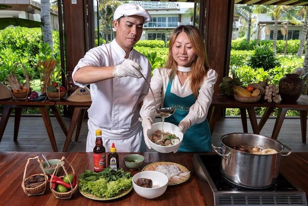 Khách lưu trú bốn đêm được trải nghiệm thêm lớp học nấu các món ăn truyền thống như bò lá lốt, gỏi cuốn và phở tại nhà hàng biển Atlantis