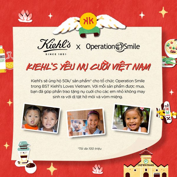 Kiehl’s, thương hiệu mỹ phẩm cao cấp của New York (Mỹ) sẽ hợp tác với tổ chức Phẫu thuật Nụ cười (Operation Smile) để mang lại nụ cười cho trẻ em kém may mắn tại Việt Nam thông qua việc đóng góp một phần doanh thu từ bộ sưu tập phiên bản giới hạn Kiehl’s Loves Vietnam.