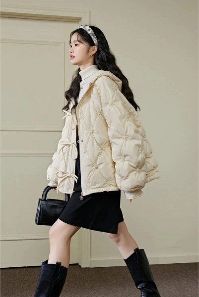 Để bắt mắt hơn, nhiều hãng còn biến tấu áo chần bông với chi tiết đính nơ, đính cườm, giúp thiết kế thêm trẻ trung.