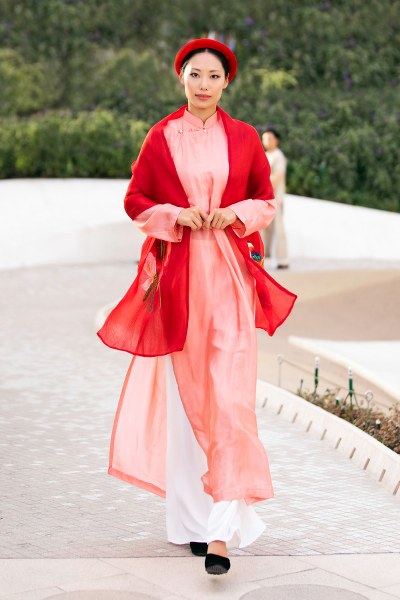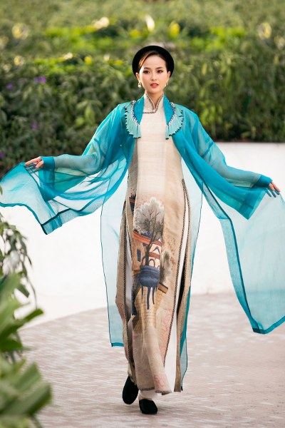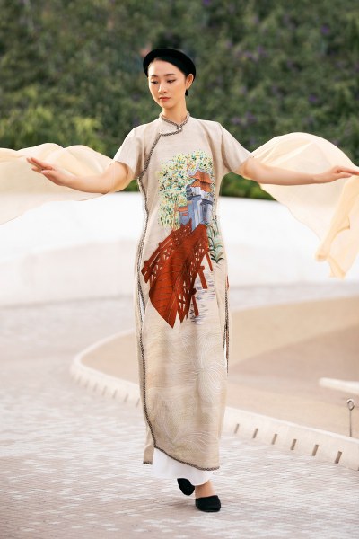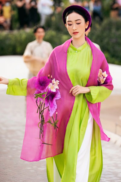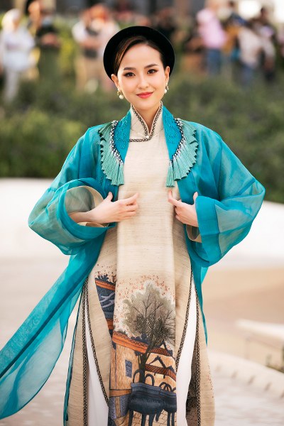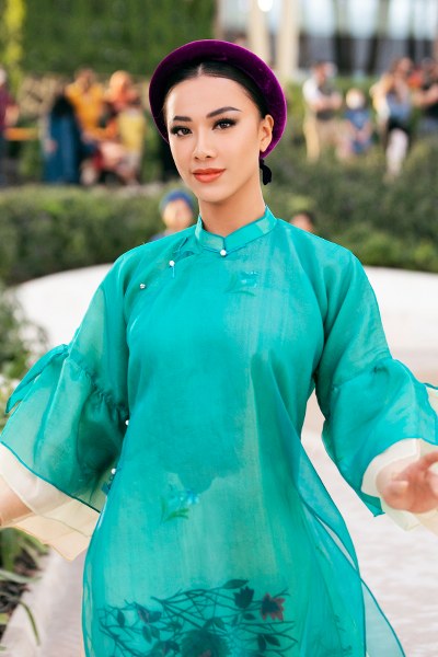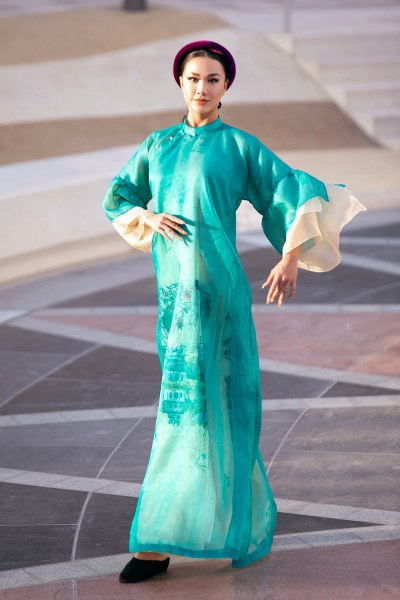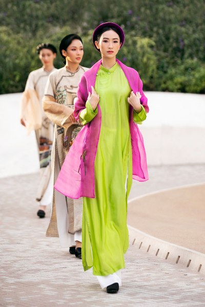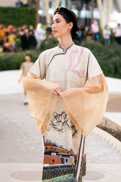 Á hậu Kim Duyên đảm nhận vai trò mở màn cho bộ sưu tập áo dài của NTK Vũ Việt Hà tại Dubai.
