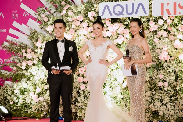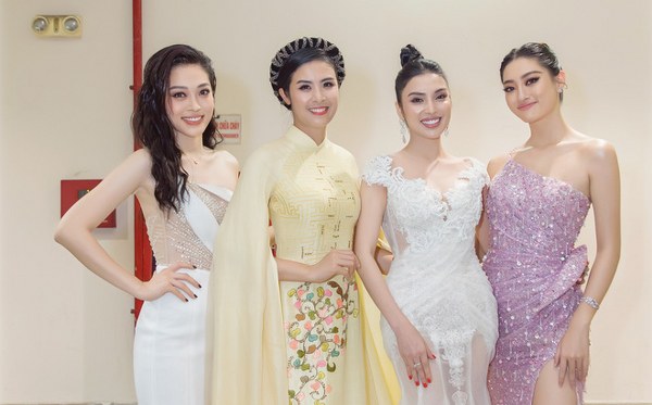 Nữ MC còn đứng chung khuôn hình cùng Hoa hậu Lương Thùy Linh và Hoa hậu Ngọc Hân, Á hậu Phương Nga.