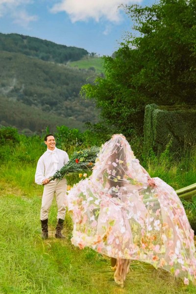 Trong hình, Kim Lý mặc đồ chú rể với bó hoa lớn trên tay, nở nụ cười tươi hạnh phúc. Trong khi đó, Hồ Ngọc Hà mặc váy hồng ngọt ngào, đội khăn voan dài chấm chân với những bông hoa đủ màu sắc. Bức hình được chụp ở khung cảnh thiên nhiên hùng vĩ, xanh mát.
