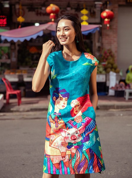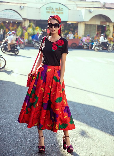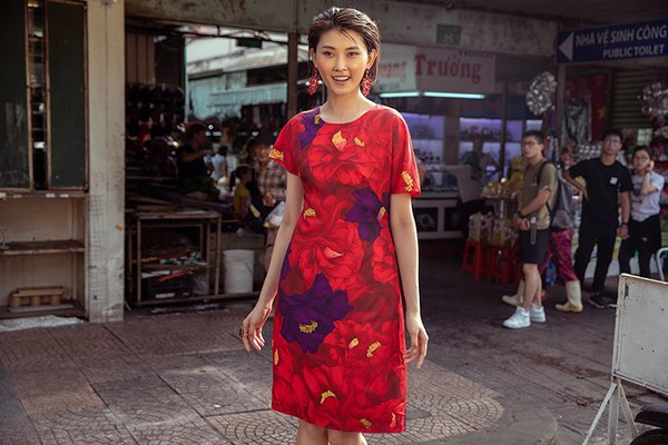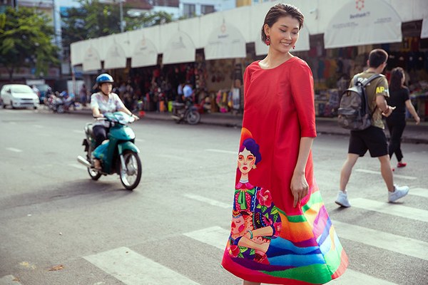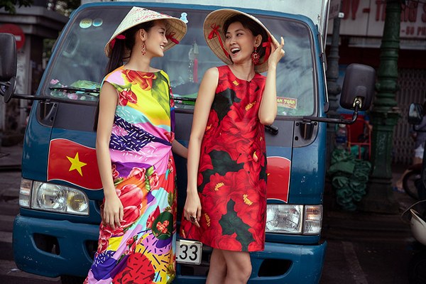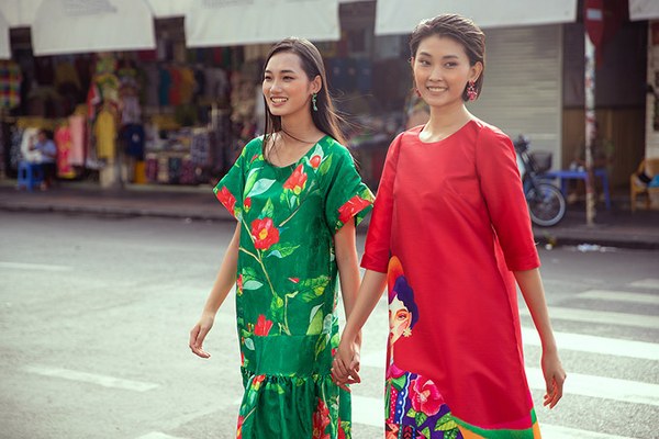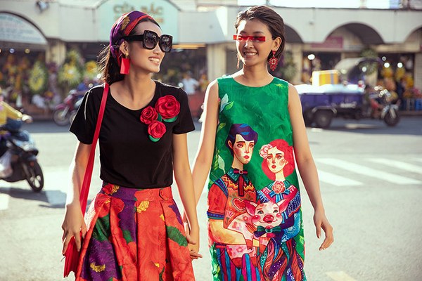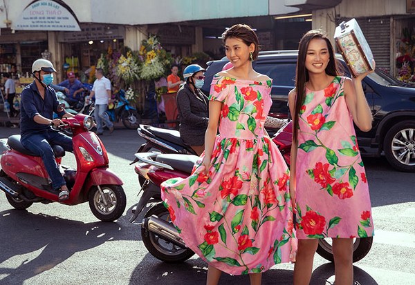 Hai người mẫu mặc trang phục họa tiết hoa hải đường, nắm tay nhau dạo chơi, khoe sắc ở trung tâm Sài Gòn.