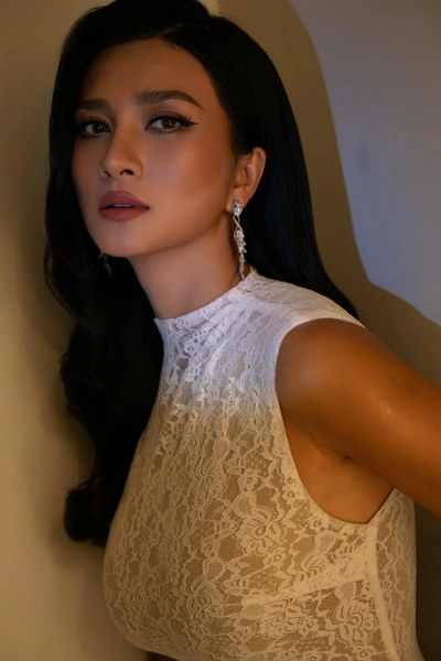 Cô kết hợp trang phục xuyên thấu với phụ kiện ánh kim đồng điệu. Nhờ khuôn mặt khả ái, giàu biểu cảm, Kim Tuyến được nhiều đạo diễn mời góp mặt trong loạt phim truyền hình lẫn điện ảnh.