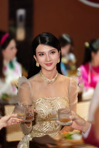 Cũng với kiểu dáng hở vai, cô chọn bộ áo dài cách tân cổ yếm - xu hướng được nhiều người đẹp hưởng ứng năm nay.