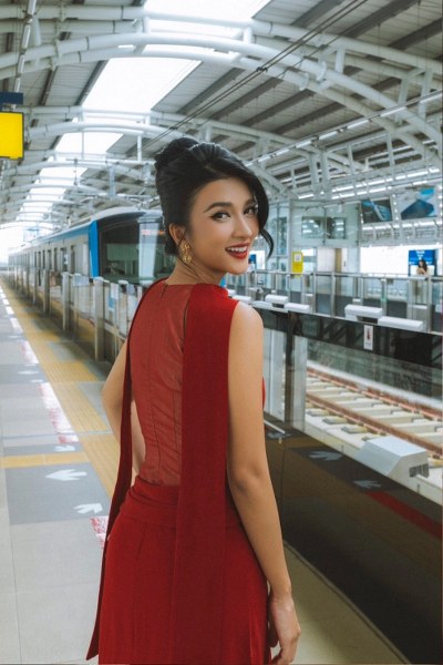Diễn viên để tóc búi cao, xõa lọn hai bên mai khi chụp ảnh thời trang ở sân ga Metro, TPHCM.