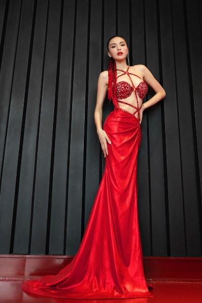 Hoa hậu Kỳ Duyên khoe body \"khét lẹt\" trong loạt ảnh diện váy đỏ rực cắt xẻ phức tạp.
