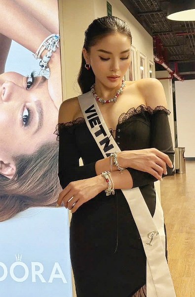 Trong tuần đầu tiên tham gia cuộc thi, Kỳ Duyên gây chú ý về gu mặc. Hôm 4/11, mỹ nhân diện đầm xẻ ngực, đính tua rua, phối thêm găng tay tiệp màu, đeo phụ kiện vòng cổ, bông tai Dior. Hoa hậu trang điểm với màu son trầm, kết hợp kiểu tóc có độ phồng tự nhiên.