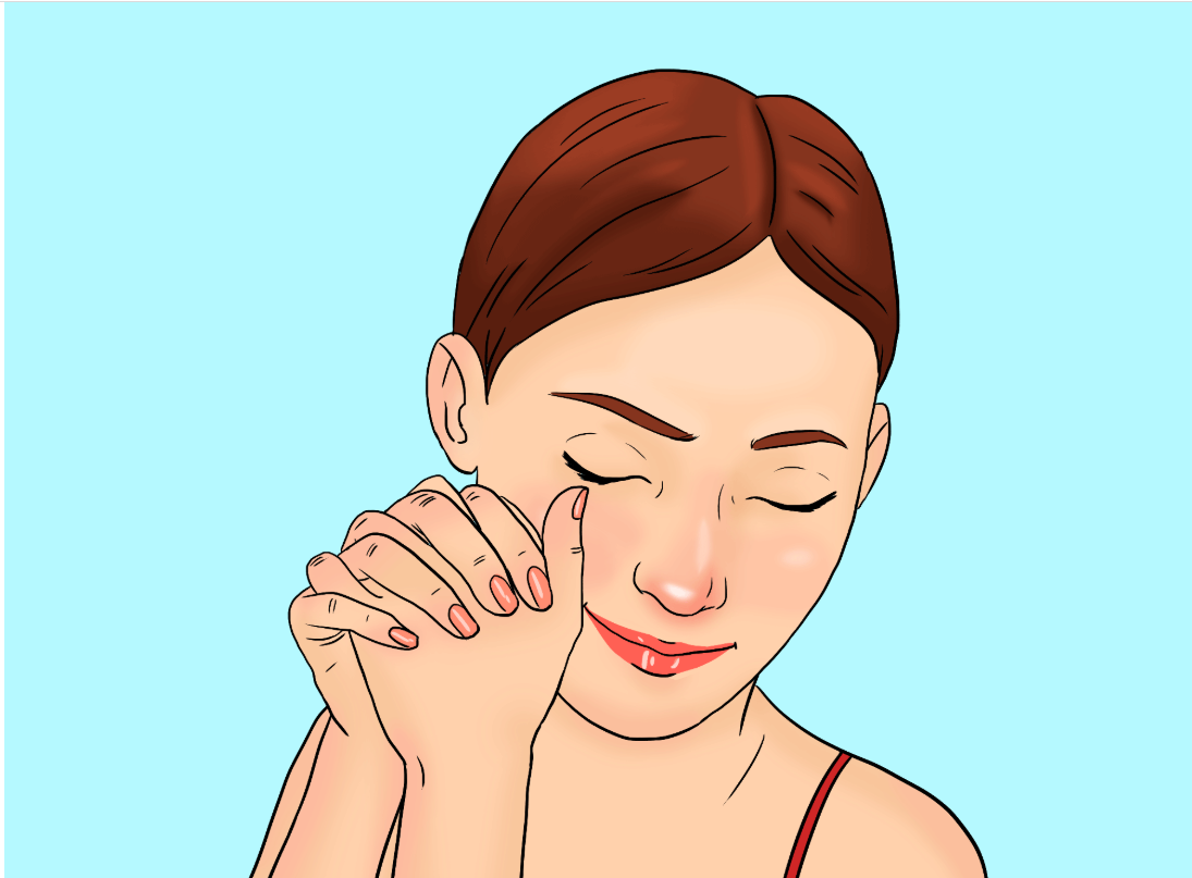 Khóa hai bàn tay lại với nhau, chỉ giữ thẳng một ngón cái. Đặt đầu ngón cái bên phải vào dưới mắt trái nơi gần mũi và vừa ấn vừa trượt tay về phía tai rồi trượt nhẹ tiếp xuống đường viền cổ áo bên – từ dái tai đến xương đòn. Lặp lại phần cuối của bài tập 2 lần.
