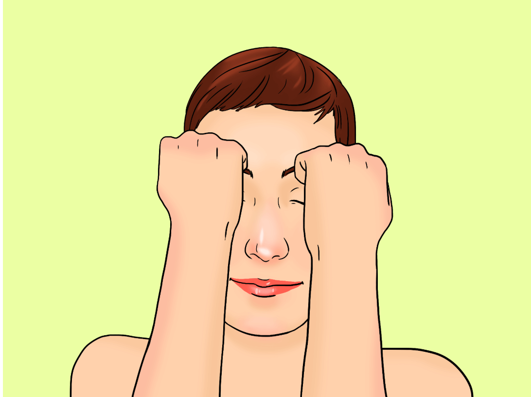 Đầu hơi cúi xuống. Tay co thành nắm đấm. Dùng ngón giữa để nhấn vào vị trí sát đường chân tóc. Tiếp tục nhấn trong khi trượt tay về phía thái dương và dái tai dọc theo đường chân tóc. Sau đó, từ từ di chuyển ngón tay xuống cổ cho đến khi bạn chạm tới xương đòn.
