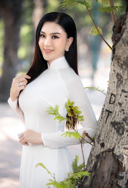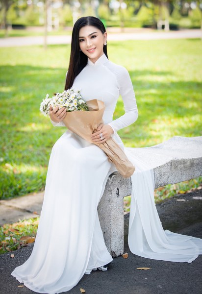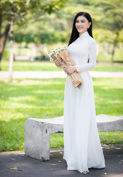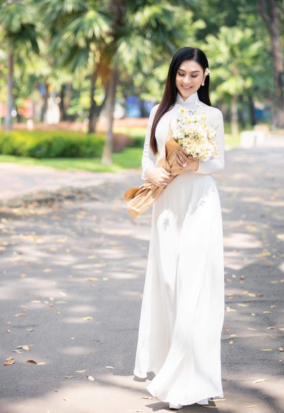 Ca sĩ chuyển giới Lâm Khánh Chi diện áo dài trắng, khoe vóc dáng thon thả và thần thái trẻ trung như nữ sinh khi đi dạo trong công viên.