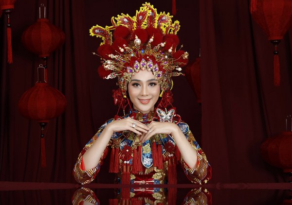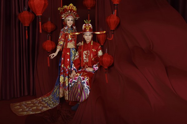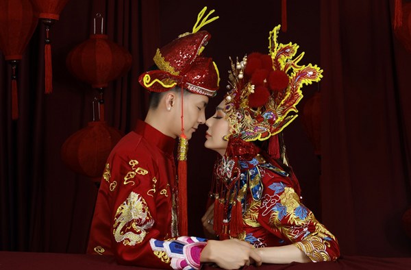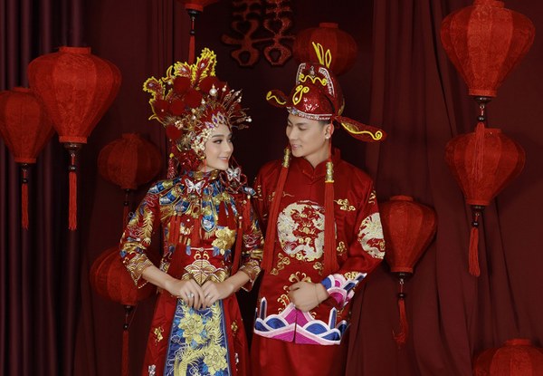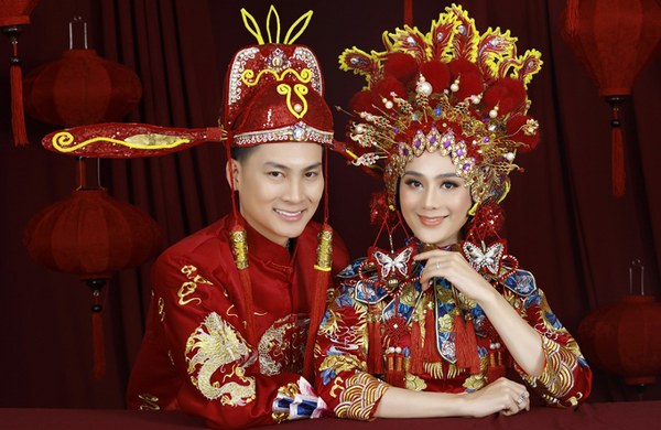 Vợ chồng ca sĩ chuyển giới mặc trang phục cô dâu, chú rể thời xưa, tình tứ làm mẫu ảnh cùng nhau.