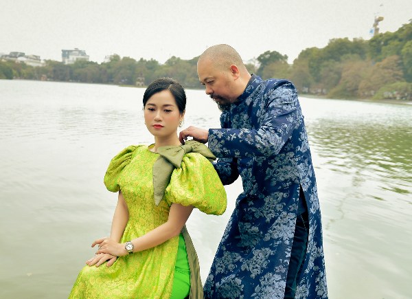 NTK Đức Hùng chỉnh trang phục cho Lâm Vỹ Dạ khi thực hiện bộ ảnh