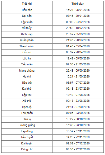 Lịch chi tiết 24 tiết khí năm 2026