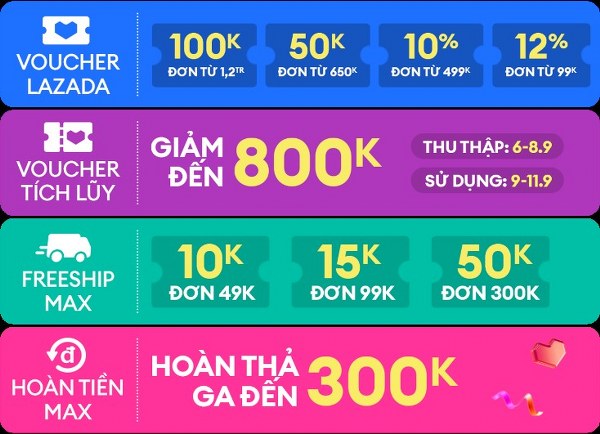 Từ ngày 9/9 – 11/9, khách hàng khi mua sắm trên Lazada sẽ được hưởng ưu đãi giảm giá lên đến 50% từ hàng ngàn thương hiệu uy tín và đa dạng như thời trang, làm đẹp, điện tử, nhà cửa đời sống, mẹ & bé… Đây sẽ là cơ hội để các tín đồ thỏa thích mua sắm sản phẩm chất lượng, chính hãng mà không cần lo lắng về giá.