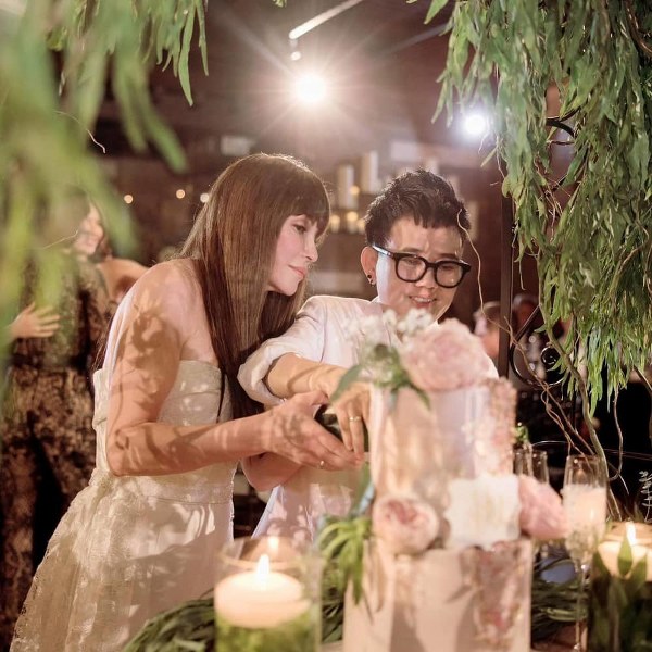 Lễ cưới diễn ra trong không gian ấm cúng, với sự tham gia của một số bạn bè, đồng nghiệp thân thiết. Trong hôn lễ, Thanh Hà diện váy cưới trắng cúp ngực. Phương Uyên mặc suit trắng đồng điệu.