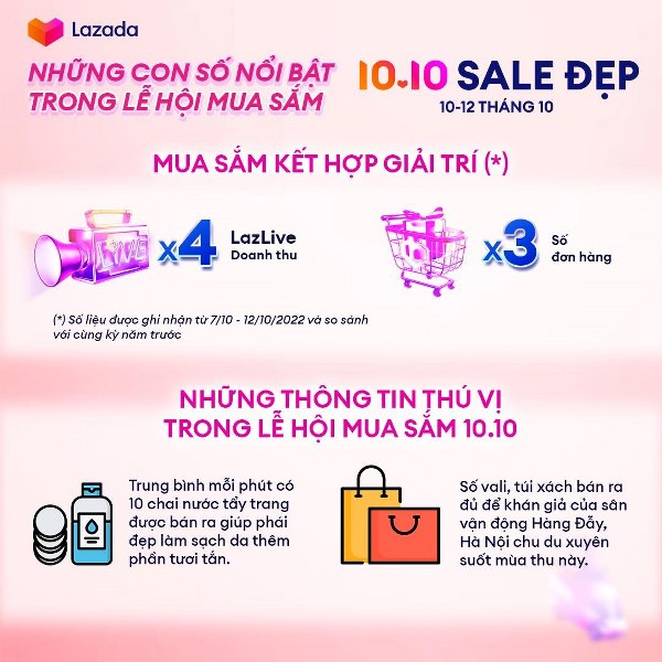 Từ ngày 10 tới 12/10/2022 vừa qua, Lazada đã tổ chức Lễ hội mua sắm 10.10 "Sale Đẹp" với mục tiêu mang đến cho người tiêu dùng cơ hội mua sắm thú vị, thoải mái và tiết kiệm. Sự kiện này mang đã đến hàng loạt những mặt hàng được giảm giá đến 50% và ưu đãi mua 1 tặng 1. Ngoài ra, người dùng còn được tận hưởng vô số khuyến mãi như voucher tích luỹ 800K, voucher freeship toàn quốc… xuyên suốt Lễ hội mua sắm này.