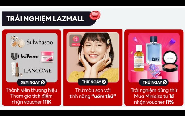 Chuỗi ưu đãi trải nghiệm thế giới LazMall hữu ích và thú vị chỉ có trên ứng dụng Lazada với: voucher nhà bán hàng độc quyền dành riêng cho khách hàng đăng ký Thành Viên Thương Hiệu, Trải Nghiệm Sản Phẩm Dùng Thử từ 1đ cùng tính năng "Ướm thử" màu son độc đáo thể hiện ngay trên trang sản phẩm của các thương hiệu hàng đầu như M.A.C, Nars, L’oreal, Shu Uemura, Lancôme…