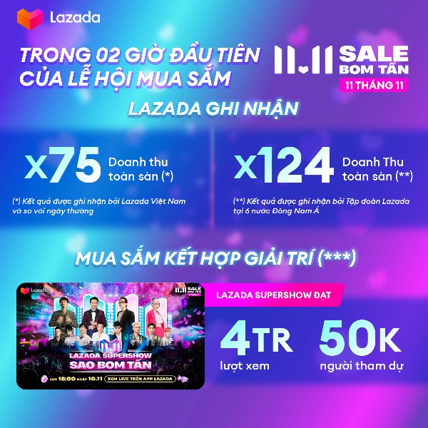 Lazada Supershow 11.11 "Sao bom tấn" đã mang đến đại tiệc mua sắm kết hợp giải trí bùng nổ khi đã thu hút hơn 50.000 khán giả tham dự tại sự kiện và hơn 4 triệu khán giả trên toàn quốc theo dõi trực tuyến trên các nền tảng xã hội và kênh LazLive của Lazada.