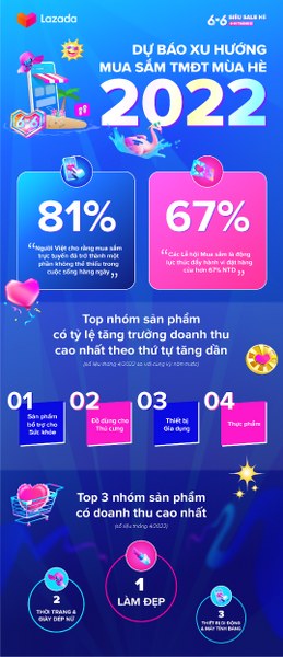 Số liệu ghi nhận xuyên suốt các Lễ hội mua sắm và chương trình khuyến mại diễn ra trong Quý I và nửa đầu Quý II năm 2022 trên sàn TMĐT Lazada Việt Nam cho thấy: người tiêu dùng Việt tiếp tục duy trì thói quen mua sắm trực tuyến. Đặc biệt, hành vi tìm kiếm và mua sắm của người tiêu dùng trên sàn cũng cho thấy các ngành hàng phục vụ cho nhu cầu làm đẹp, du lịch, thời trang và chăm sóc sức khỏe được dự báo sẽ tăng mạnh trong thời gian tới.