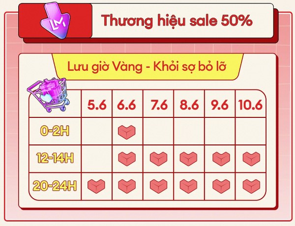 Cuối cùng, muốn săn được deal hời thì chắc chắn phải thuộc nằm lòng các khung giờ vàng của Lazada. Bên cạnh hai cột mốc 12h trưa và 20h mỗi ngày từ 6/6 đến 10/6 , các tín đồ mua sắm cũng nên ghi nhớ hai khung giờ đặc biệt đó là 8h tối ngày 5/6 và 0h đêm ngày 6/6, thời điểm đổ bộ của loạt thương hiệu được yêu thích từ đa dạng các ngành hàng trên Lazada. Còn chần chừ gì nữa mà không mở điện thoại lên đặt báo thức hoặc gửi ngay cho bạn cùng phòng để có người nhắc giờ săn “Sale to khỏi so” trên Lazada bạn nhé.