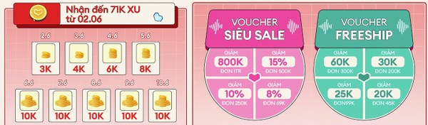 Tiện mở ứng dụng thì ngại gì mà không ghé qua trang xu và voucher để deal hời càng hời thêm. Từ ngày 2/6, người dùng đã có thể check in nhận xu mỗi ngày với tổng giá trị lên đến 71k Xu (tương đương 71,000 VNĐ). Song song đó, trang mã giảm giá cũng chính thức tung voucher vào mỗi 9h – 12h – 20h và 0g hàng ngày, không chỉ là voucher miễn 100% phí ship, người dùng còn có thể thu thập voucher từ đối tác thanh toán, voucher nhà bán hàng và đặc biệt là voucher siêu sale giảm lên đến 800,000 VNĐ mỗi đơn.