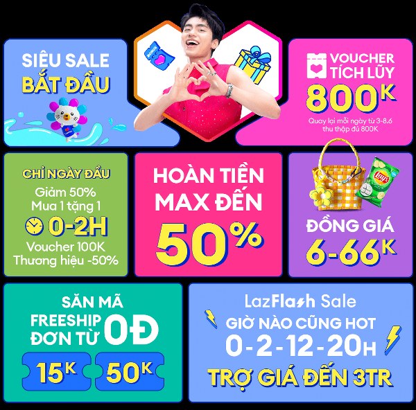 Từ ngày 6/6 – 8/6, người dùng truy cập Lazada và tận hưởng mua sắm các sản phẩm chuẩn bị cho mùa hè như thời trang hè, làm đẹp, điện tử, nhà cửa đời sống, mẹ & bé,… với mức giảm hấp dẫn đến 50%. Bên cạnh bộ ba siêu ưu đãi hoàn tiền đến 50%, voucher tích lũy 800.000 đồng và miễn phí vẫn chuyển, người dùng còn có thể săn các deal giá rẻ mỗi ngày, sale hết dưới 49.000 đồng, đồng giá 6.000 đồng, đồng giá 66.000 đồng,…để trải nghiệm mùa hè nhiều sắc màu.