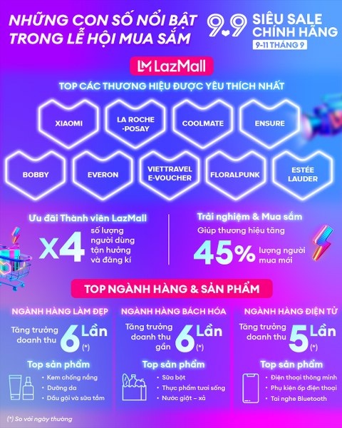 Lễ hội mua sắm 9.9 "Siêu Sale chính hãng" trên Lazada đã diễn ra thành công trong 3 ngày từ 9/9 – 11/9/2022. Đây cũng là sự kiện khởi đầu cho chuỗi lễ hội mua sắm cuối năm nhộn nhịp trên Lazada với nhiều số liệu tích cực và xu hướng mua sắm được ghi nhận.