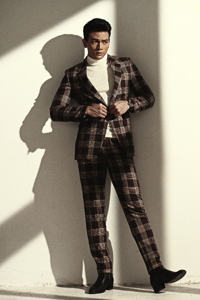 Việc diện suit với Lê Xuân Tiền không hề nhàm chán. Anh chàng chọn thiết kế kẻ caro màu trầm nhưng trông trẻ trung, lạ mắt phối cùng áo len cổ lọ bên trong.