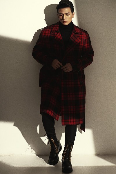 Tiết trời se lạnh cuối năm cũng là lúc những chiếc áo cổ lọ được lên ngôi. Lê Xuân Tiền phối thêm áo khoác kẻ sọc caro to bản với sắc đỏ nổi bật.