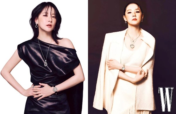 Khi phỏng vấn độc quyền ấn bản W Korea số tháng 4, người đẹp diện mốt lệch vai đơn sắc (trái) và set đồ màu kem (phải), phối trang sức Chopard.