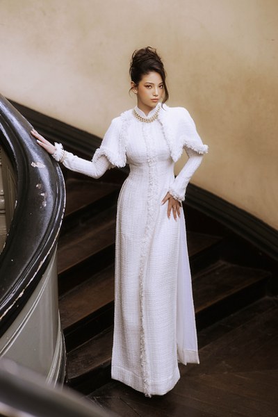 Hai mẫu áo dài vải tweed của NTK Song Toàn giúp Lily thể hiện trọn vẹn vẻ đẹp nữ tính nhưng cũng rất cá tính. Nhà thiết kế đưa chất liệu được ưa thích trong mùa đông vào dáng áo dài truyền thống và tạo điểm nhấn bằng các chi tiết đắp vai, viền cổ cánh sen, tay phồng... thời thượng.