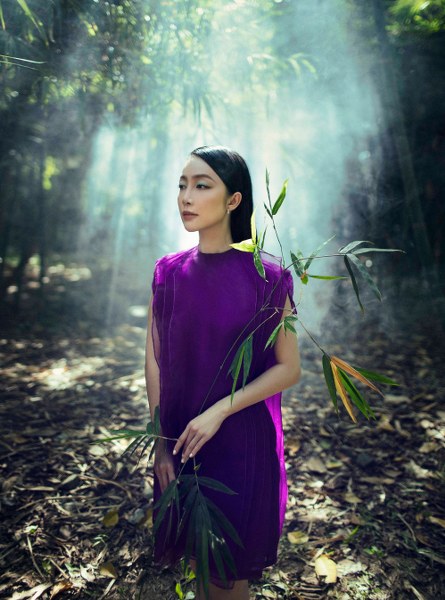 Cô e ấp, dịu dàng trong chiếc váy tím giữa không gian thiên nhiên được bao phủ bởi cỏ cây, hoa lá.