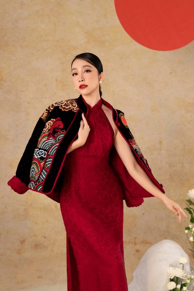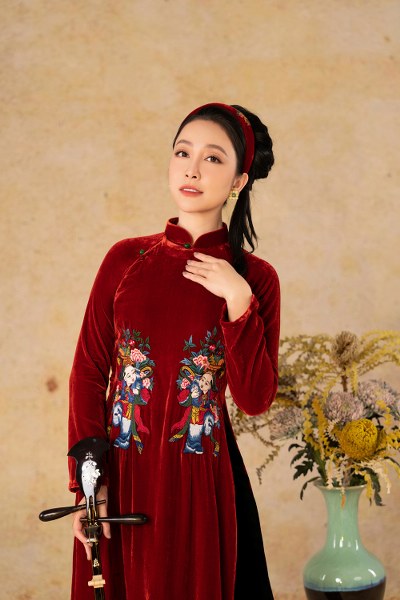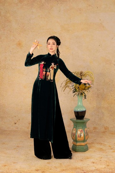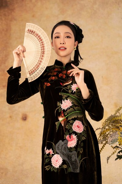 Nhà thiết kế Nguyễn Thơ Thơ chọn tranh Hàng Trống để thêu lên những trang phục của phụ nữ Việt, mong muốn quảng bá nhiều hơn hình ảnh tranh Hàng Trống đến đông đảo người Việt trẻ. Trong ảnh, Linh Nga mặc áo dài thêu bức tranh 'Tiến tài - Tiến Lộc'.