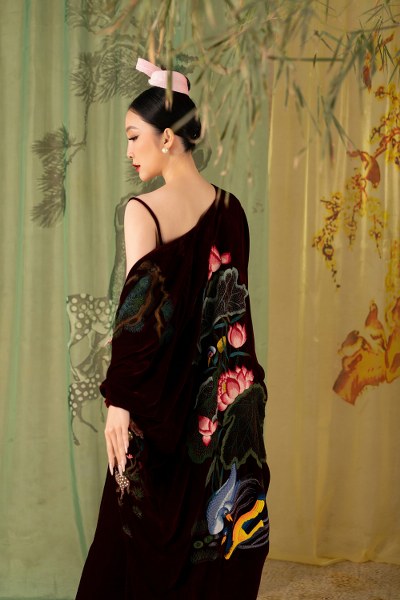 Linh Nga tiếp tục gây ấn tượng khi khoác lên mình thiết kế nhung độc đáo thêu bộ tranh 'Tứ bình' hay 'Tứ quý bốn mùa' với Mai - Sen - Cúc - Trúc tượng trưng cho 4 mùa trong năm.