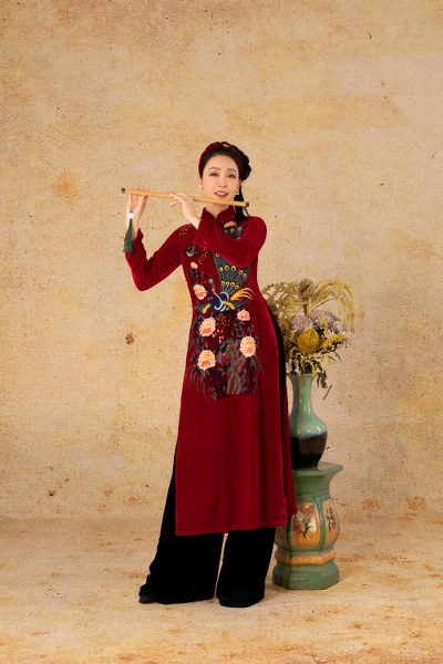 Mỗi tà áo dài của tố nữ trong bộ tranh này được thêu một bức tranh Hàng Trống. Trong ảnh, Linh Nga mặc áo dài thêu 2 bức trong bộ tố nữ: cô thổi sáo - cô đánh đàn nguyệt.